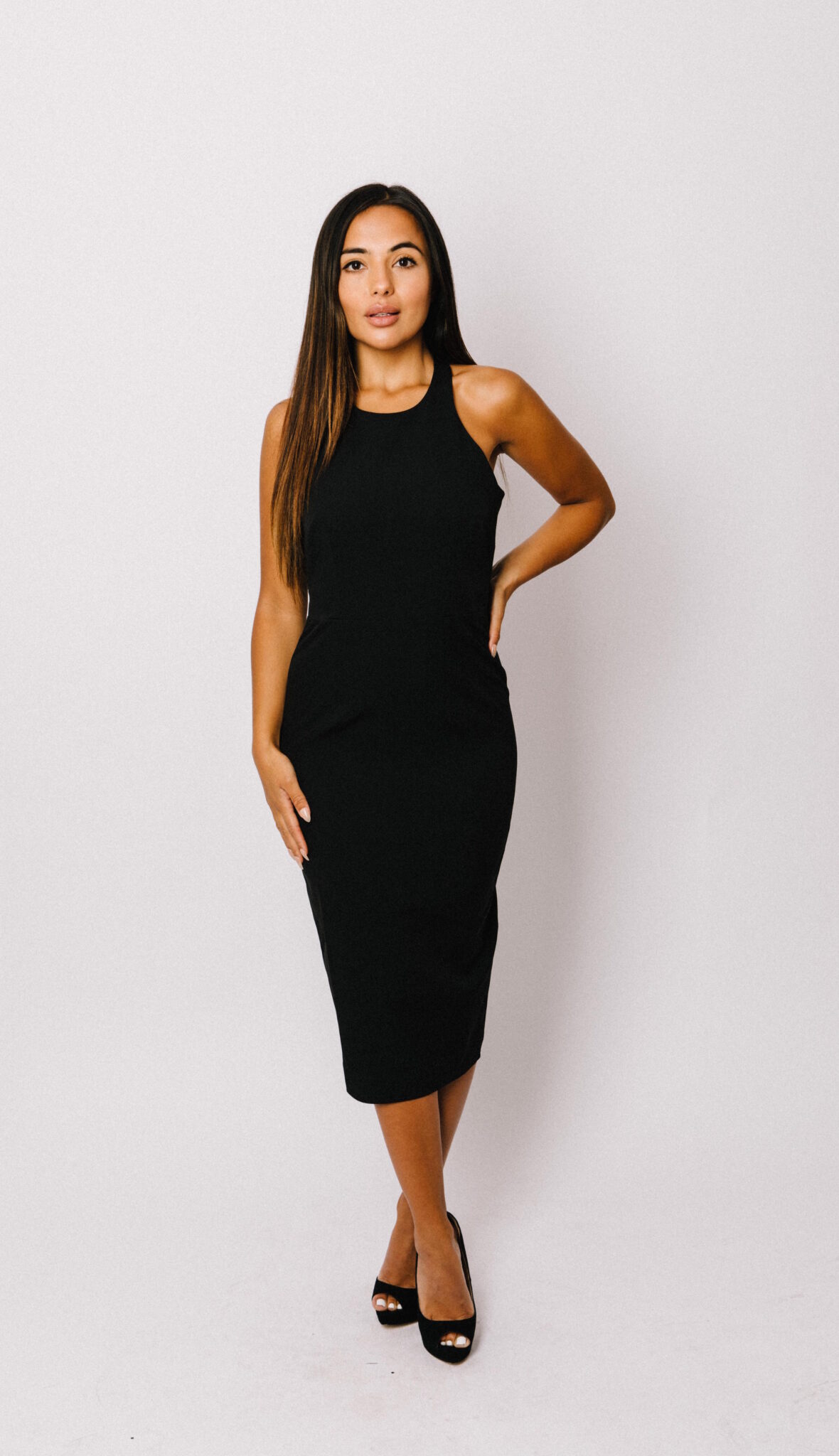 Our special Maya dress features a midi cut in soft, lavish crepe. The flattering halter neckline emphasizes a great décolleté. From the behind, the standout back feature, dips perfectly low to flatter a great back & our tie up bow back adds striking detail.